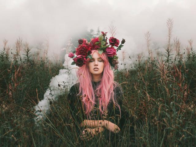 Wallpaper A girl with pink hair and a wreath on his head