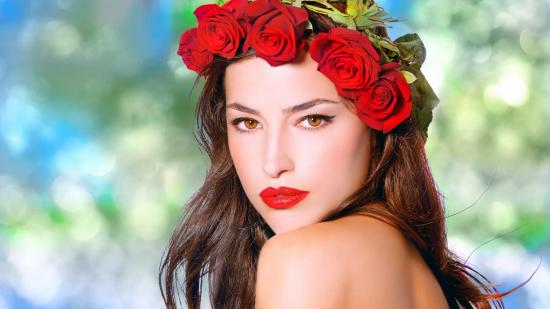 Wallpaper Beautiful brown-eyed girl with a wreath of red roses