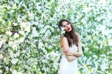 Wallpaper Beautiful young girl in the branches of a blossoming apple tree