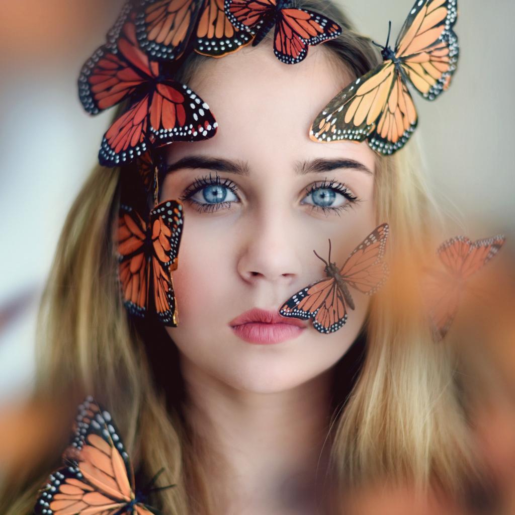 Wallpaper Blue-eyed girl with butterflies on her face