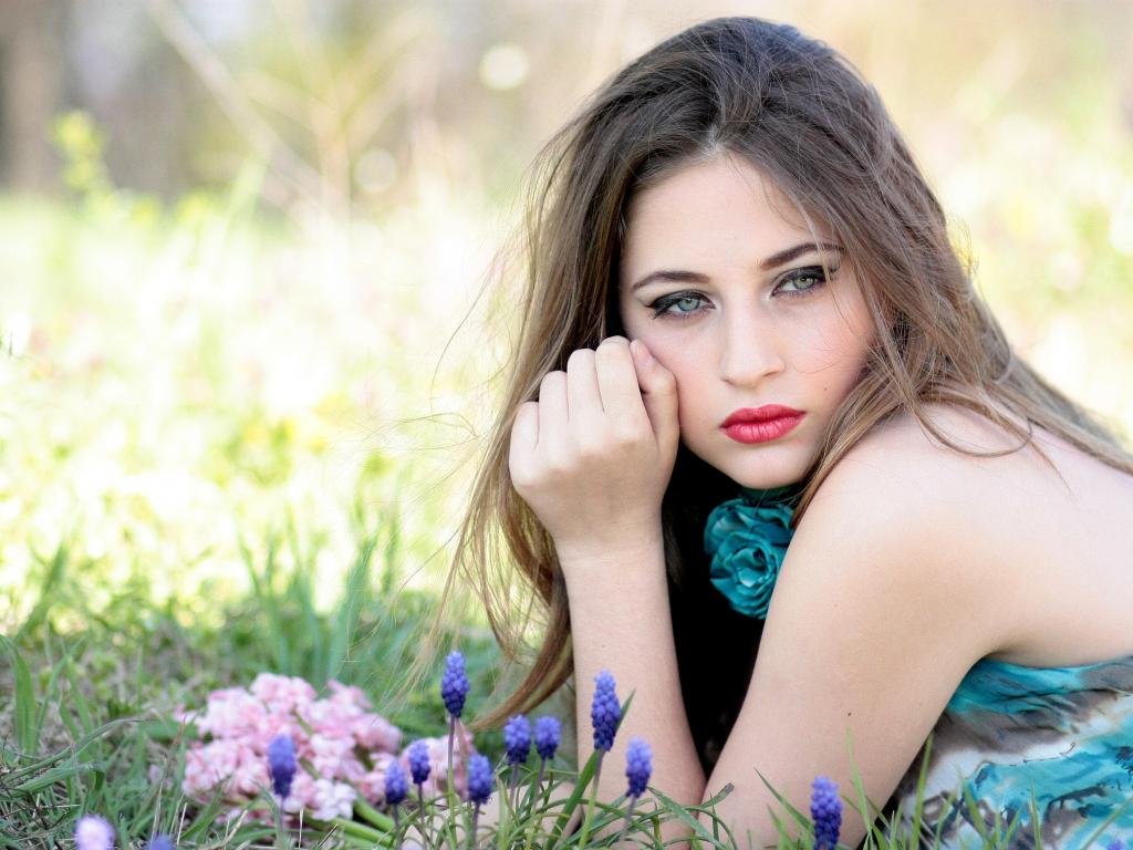 Wallpaper Young brunette girl with blue eyes lies on the grass