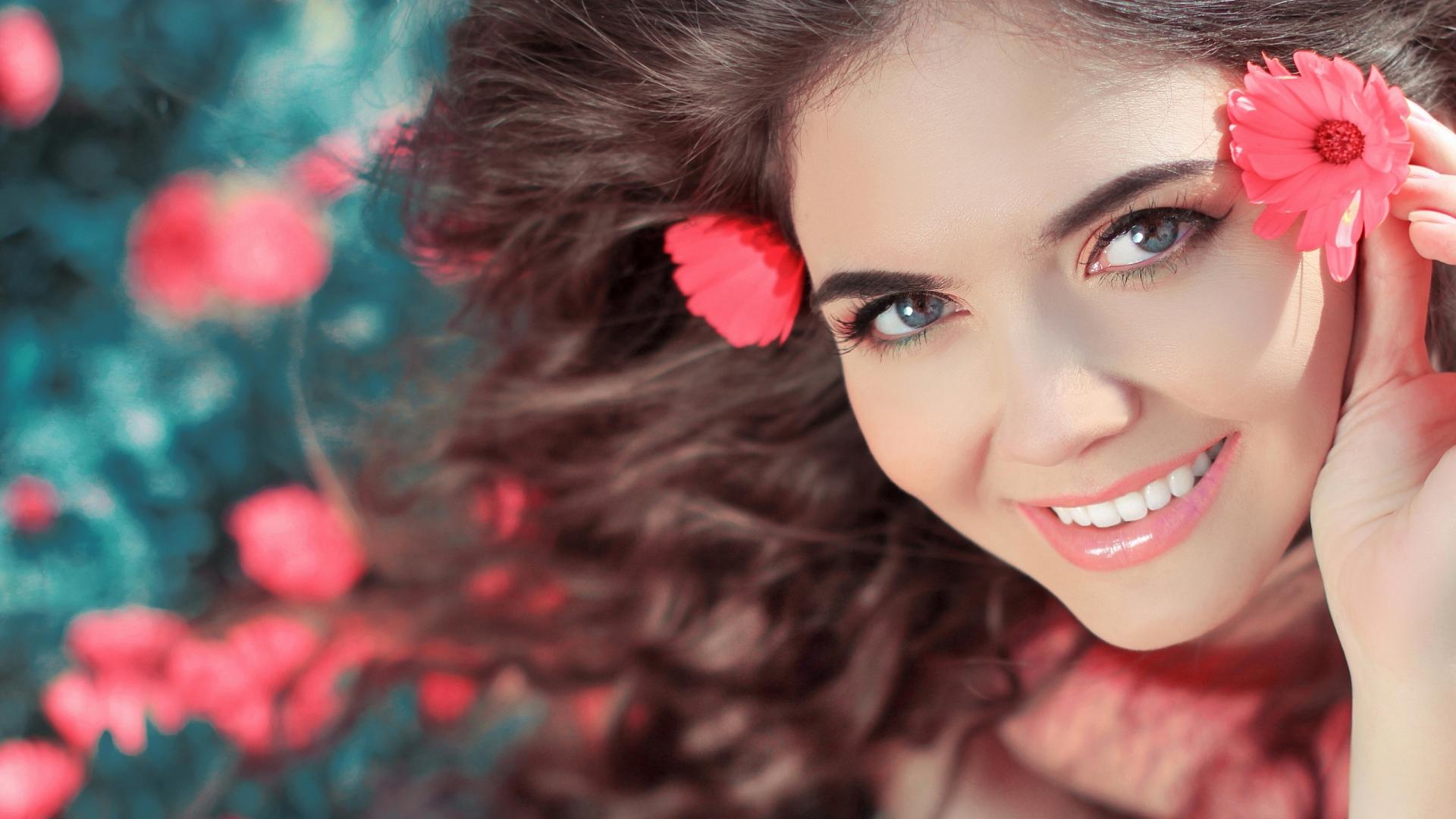 Wallpaper Beautiful smiling girl with pink flowers in her hair