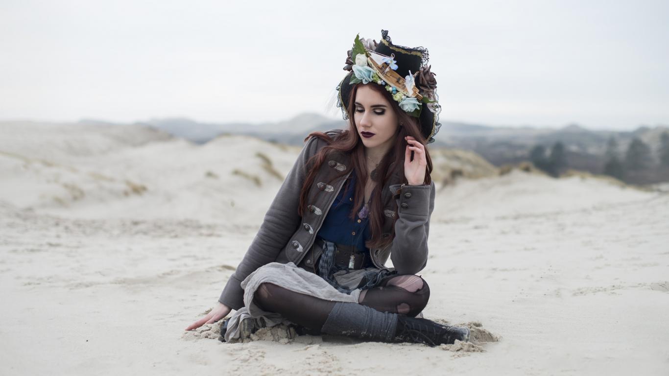 Wallpaper Brunette girl in a suit sits on the sand