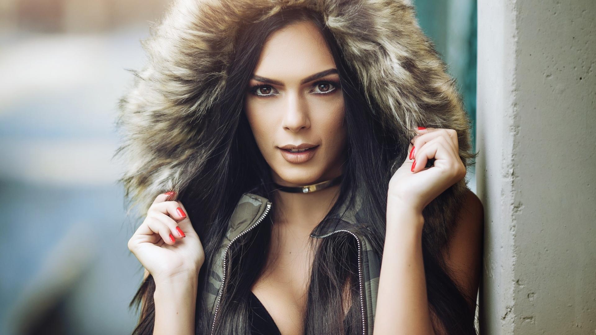 Wallpaper Brunette in a hood with red nails on hands