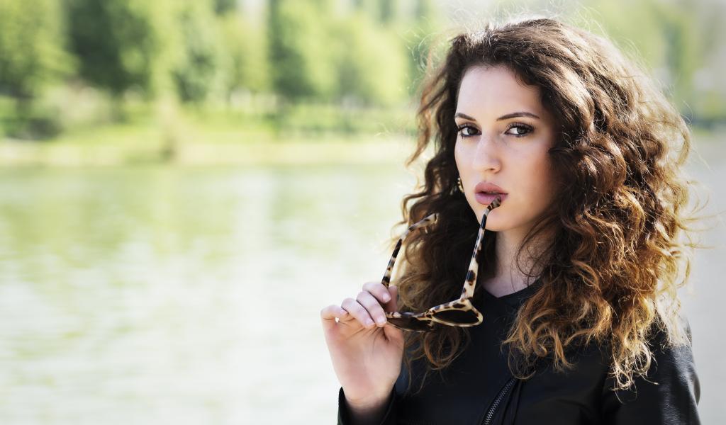 Wallpaper Beautiful girl with wavy hair with glasses in hands
