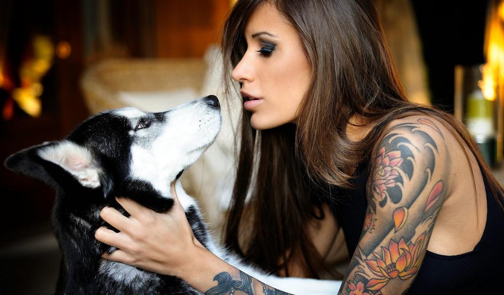 Wallpaper Girl with tattoos with a dog of the Husky breed