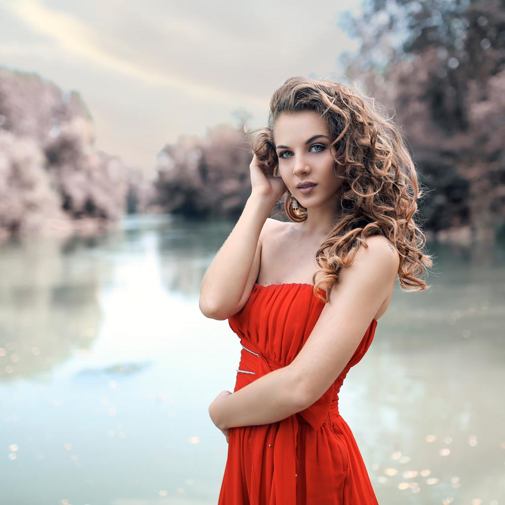 Wallpaper Beautiful brunette girl in red dress by the pond