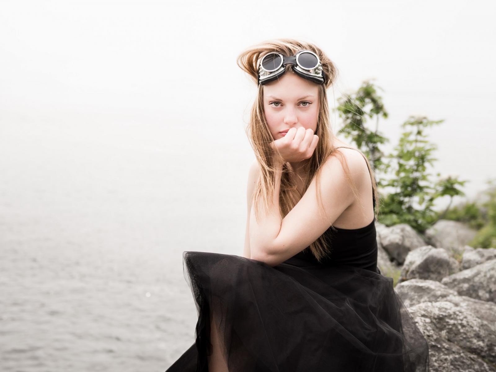 Wallpaper Blond girl with glasses on her head sits on a stone