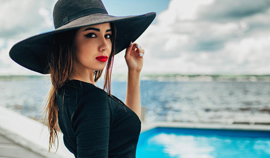 Wallpaper Beautiful girl in a big black hat by the pool