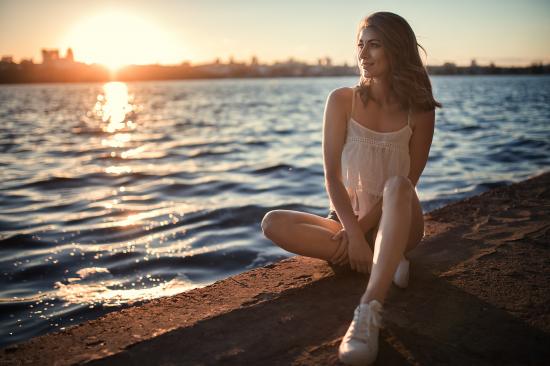 Wallpaper Beautiful smiling girl sitting in the sun by the river