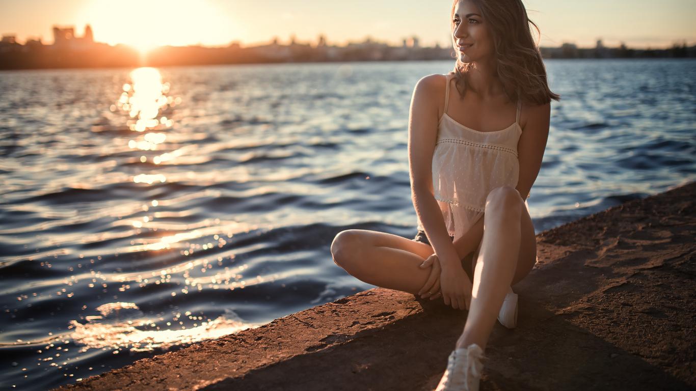 Wallpaper Beautiful smiling girl sitting in the sun by the river
