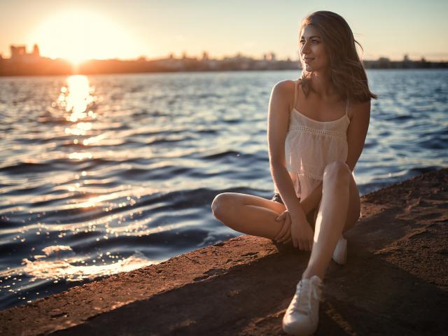 Wallpaper Beautiful smiling girl sitting in the sun by the river