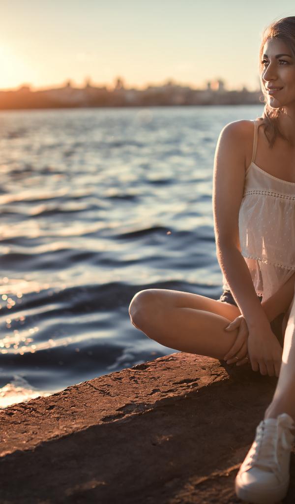 Wallpaper Beautiful smiling girl sitting in the sun by the river
