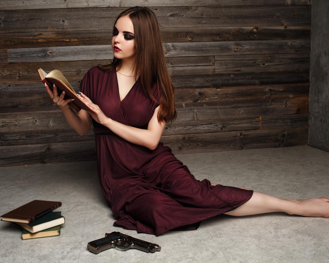 Wallpaper Beautiful girl in a burgundy dress with books