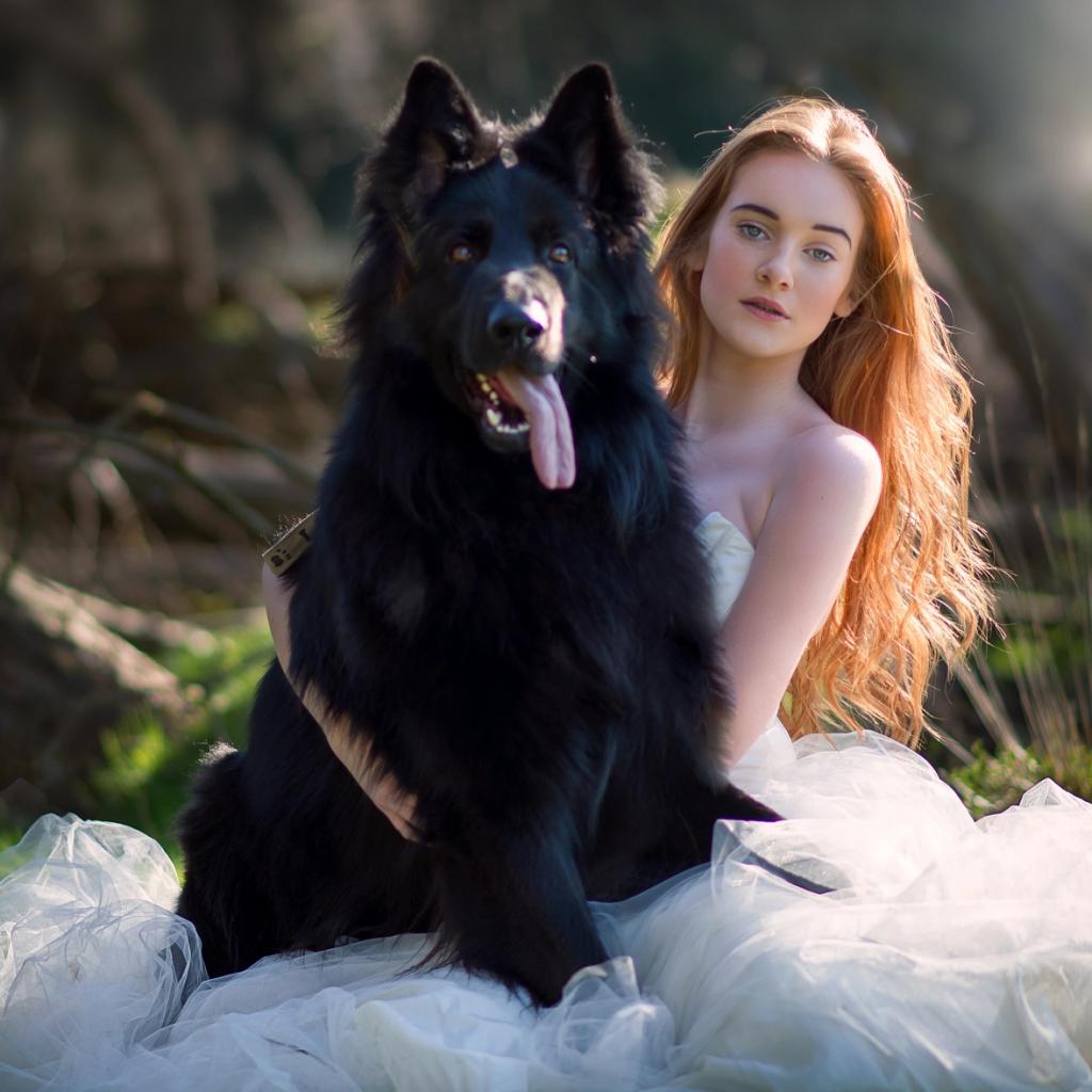 Wallpaper Beautiful bride girl with big black dog
