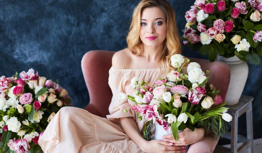 Wallpaper Beautiful blond girl sitting with a bouquet of flowers