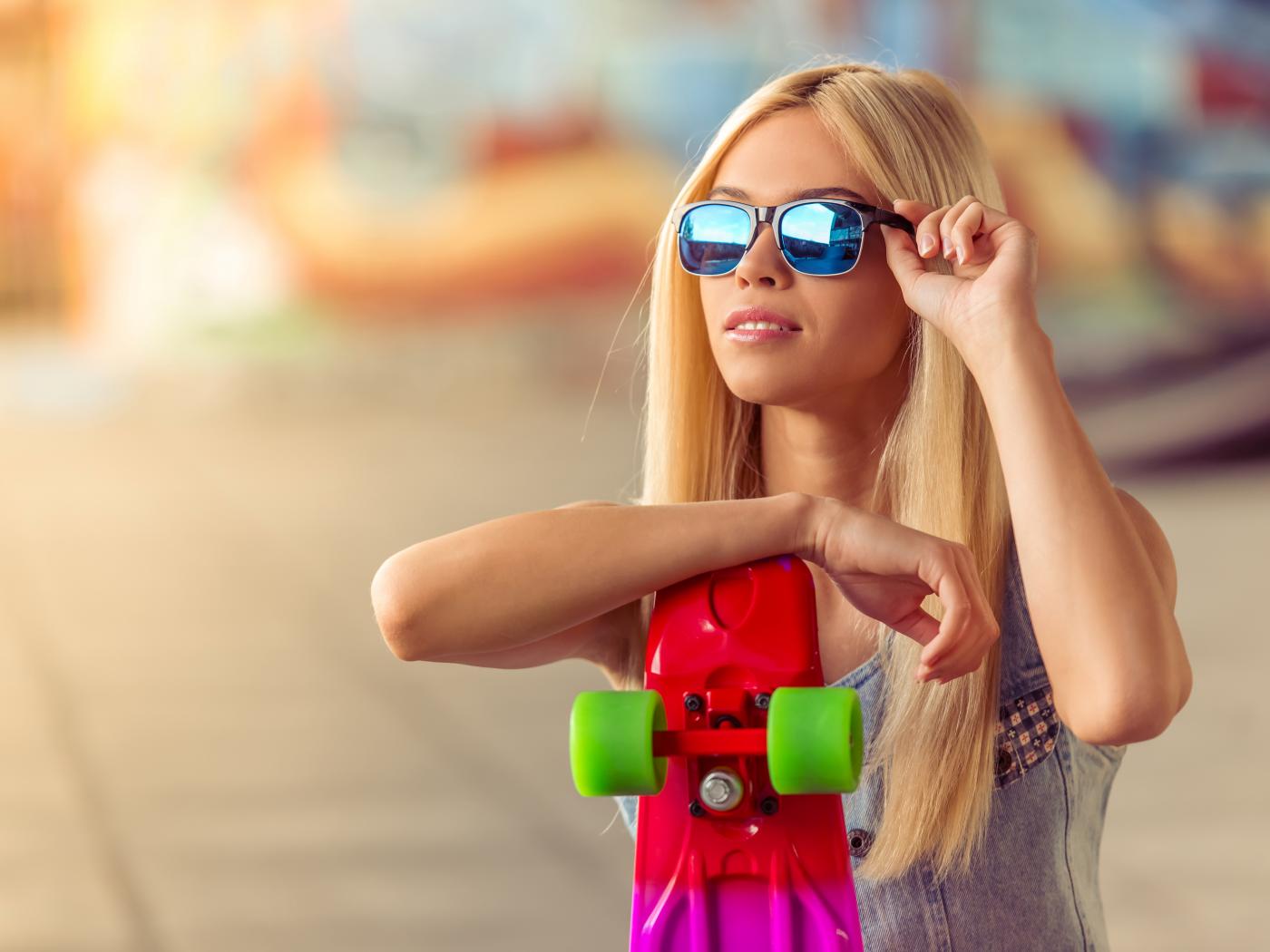 Wallpaper Young blonde in sunglasses with skateboard