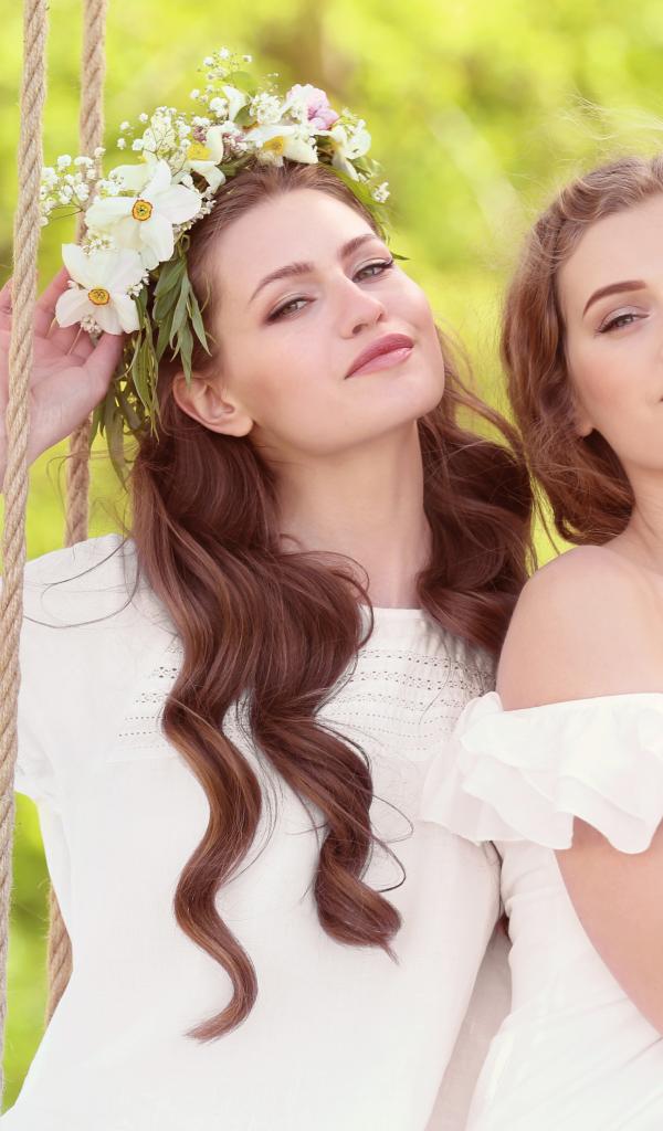 Wallpaper Two beautiful long-haired girl brown-haired on a swing