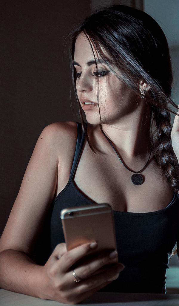 Wallpaper Beautiful brunette with phone in hands and bottle