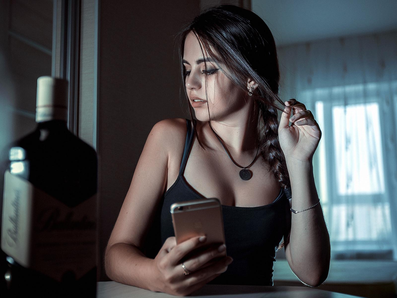 Wallpaper Beautiful brunette with phone in hands and bottle