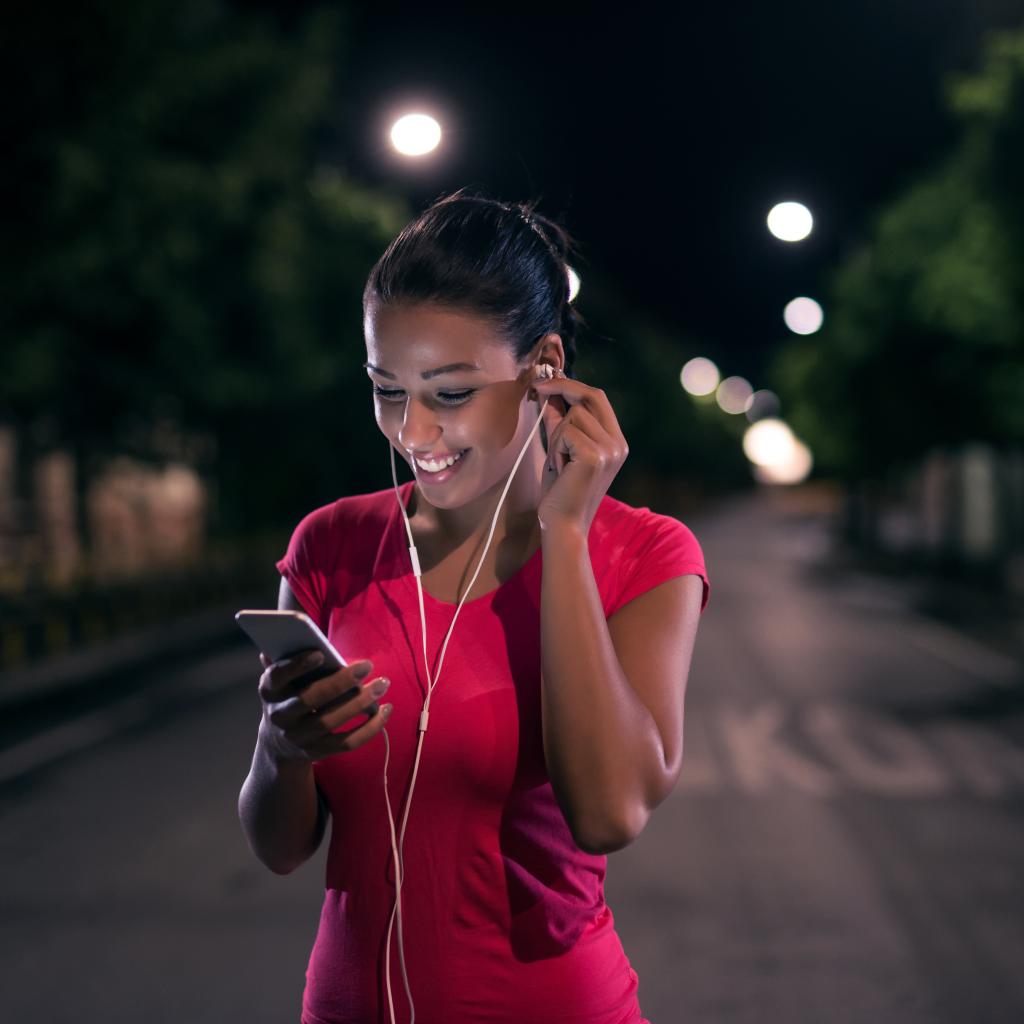 Wallpaper Young smiling girl in headphones with phone in hands