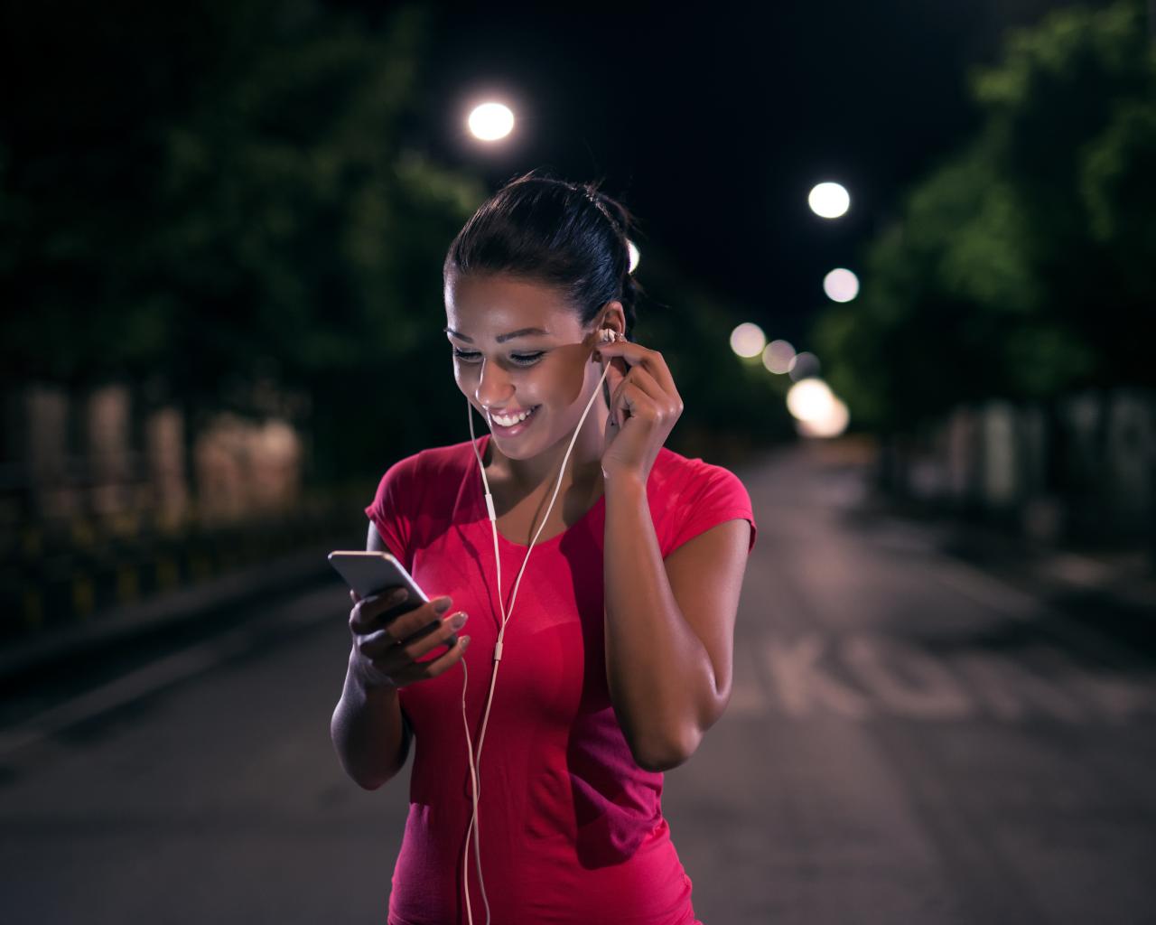 Wallpaper Young smiling girl in headphones with phone in hands