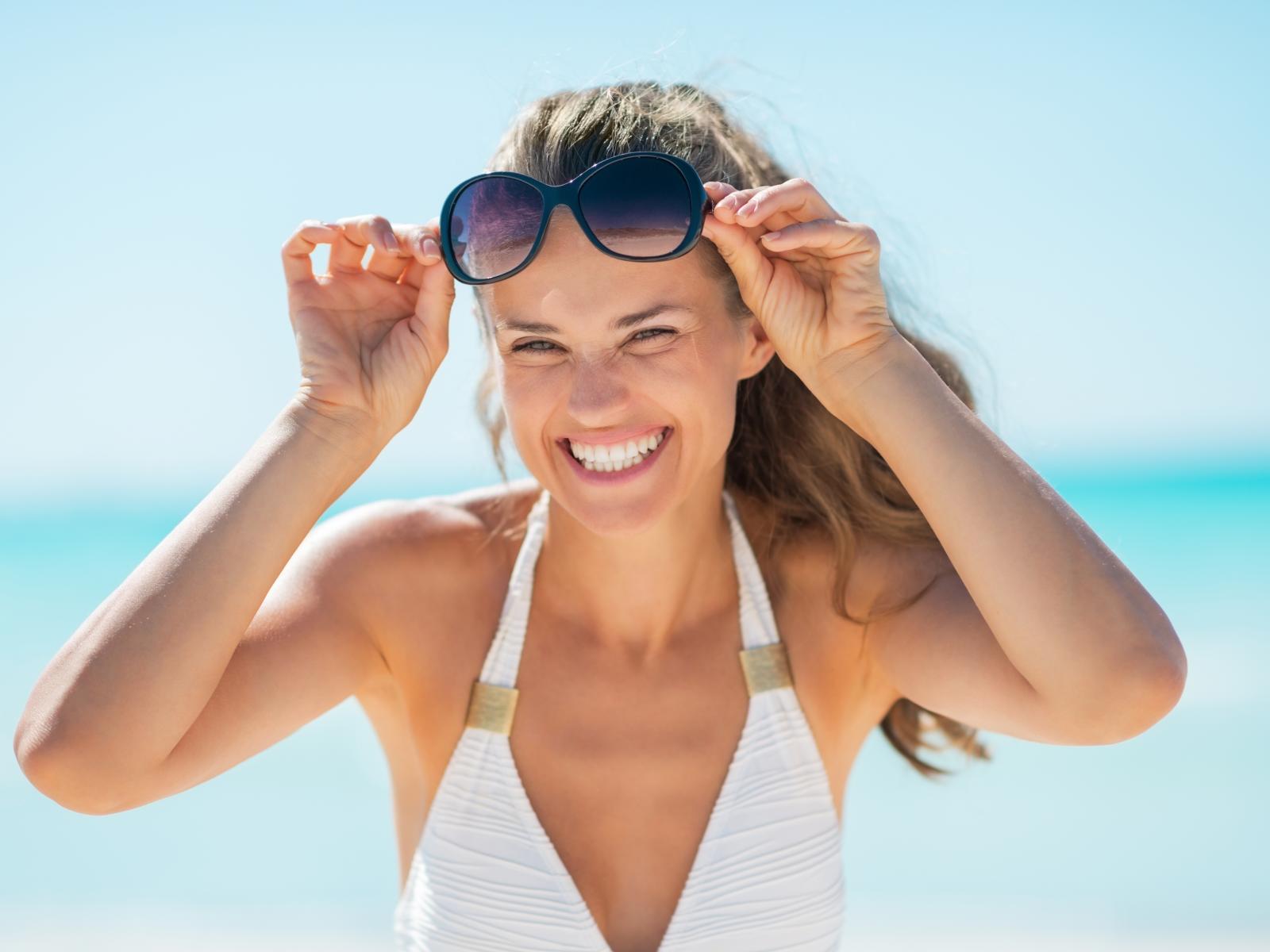 Wallpaper Smiling girl with sunglasses on her head