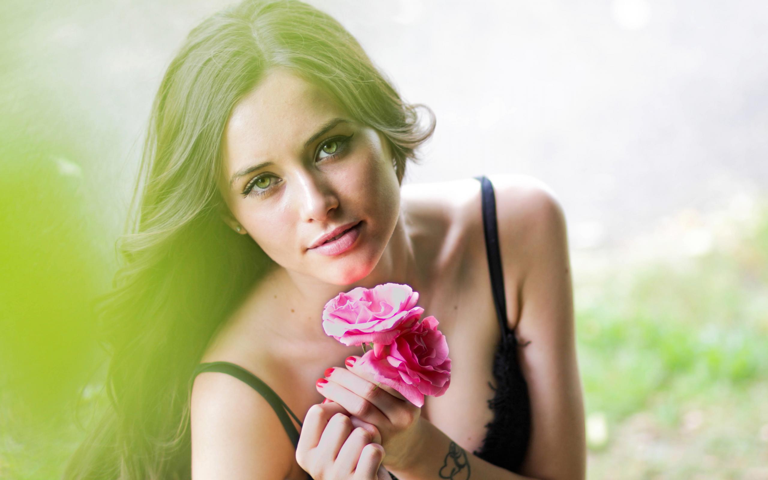 Wallpaper Beautiful girl with three red roses