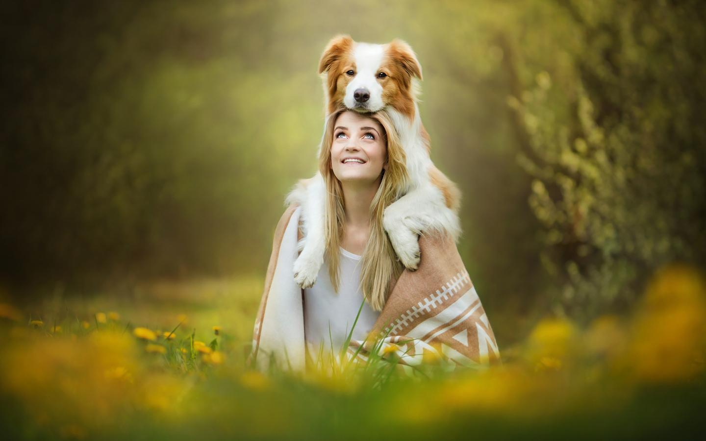 Wallpaper Smiling girl with dog sitting on the grass
