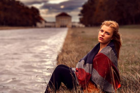 Wallpaper A girl in a plaid sits on the river bank