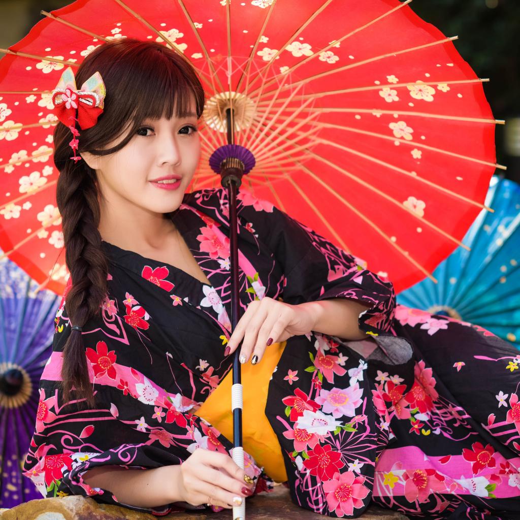 Wallpaper Young asian in a kimono with colorful umbrellas