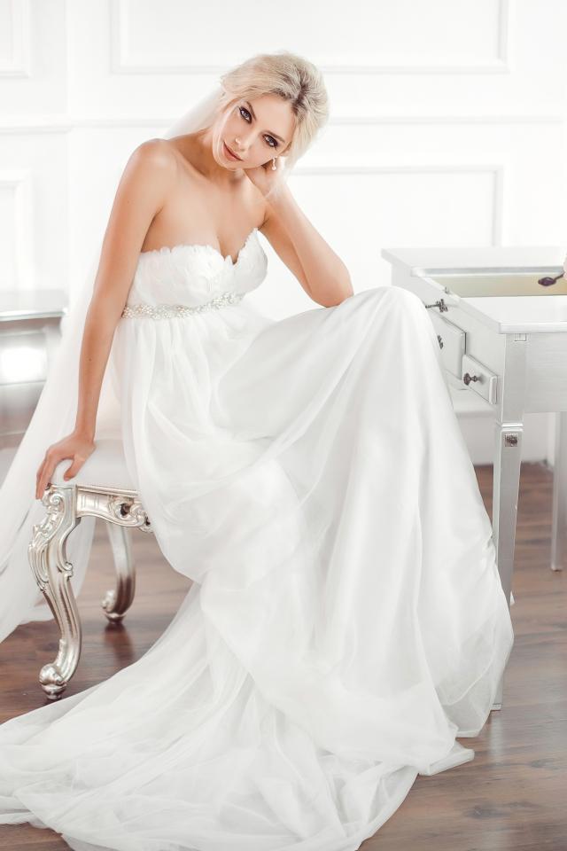 Wallpaper Beautiful blonde bride in a dress sits on a chair