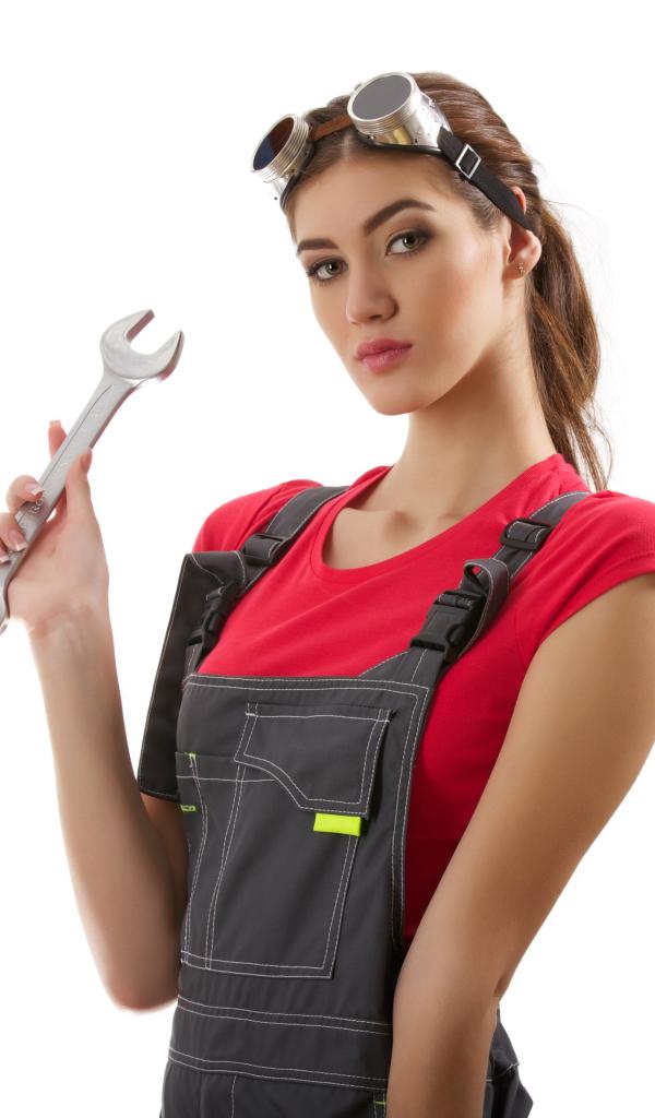 Wallpaper Mechanic girl with key in hands on white background