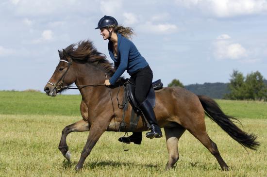 Wallpaper Young girl in helmet jumps on brown horse