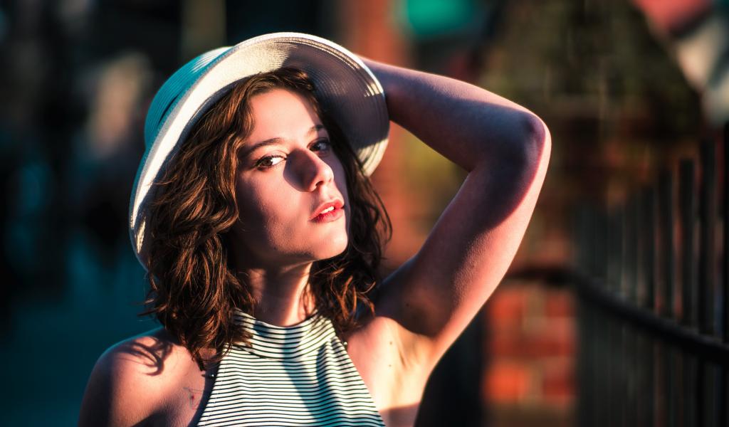Wallpaper Beautiful young girl in a white hat in the sunlight