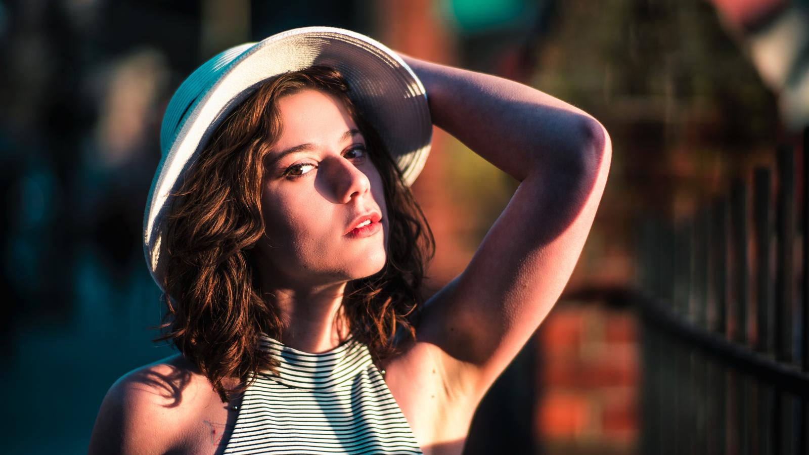 Wallpaper Beautiful young girl in a white hat in the sunlight