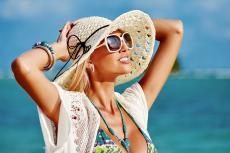Wallpaper Young blonde in a white hat and glasses on the beach