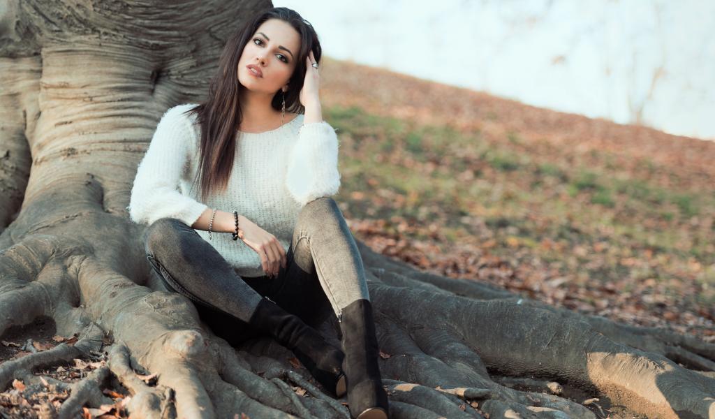 Wallpaper A beautiful girl is sitting near a tree