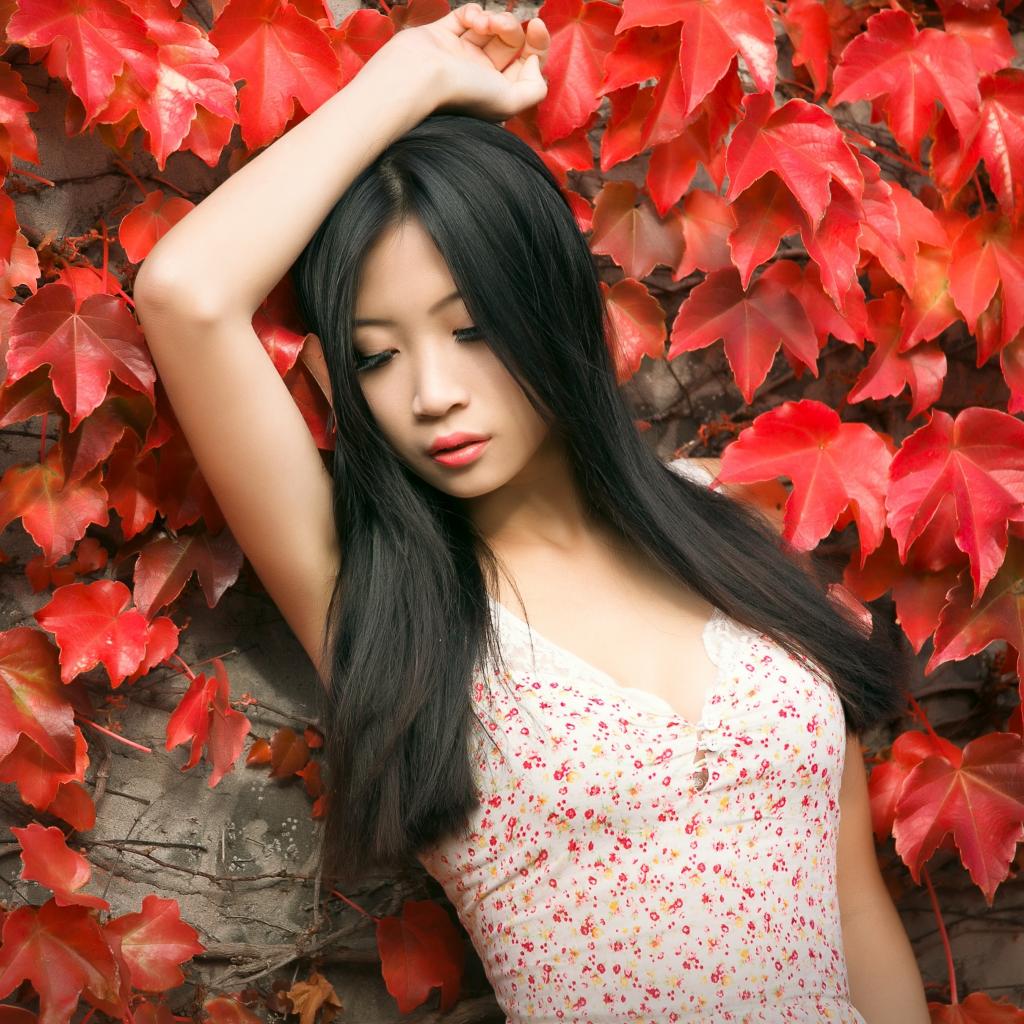 Wallpaper A young asian girl stands by the wall with red leaves