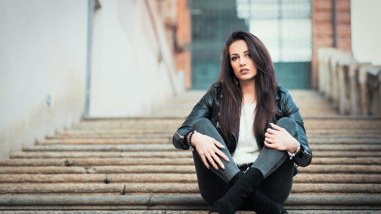 Wallpaper Young brunette sitting on the stairs