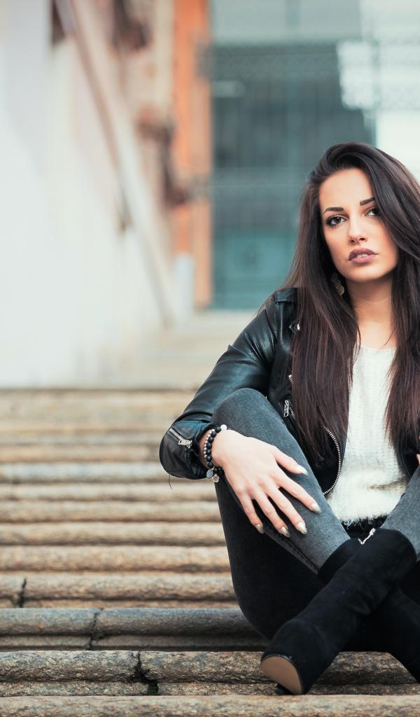 Wallpaper Young brunette sitting on the stairs