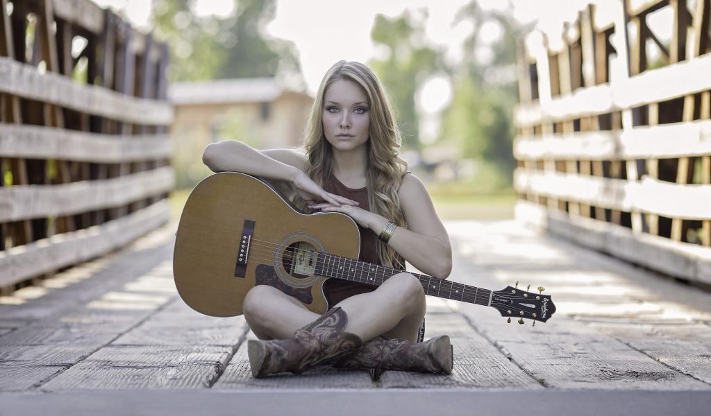 Wallpaper Young blonde girl sits on a bridge with a guitar