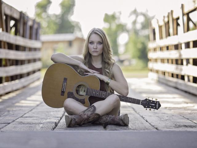 Wallpaper Young blonde girl sits on a bridge with a guitar