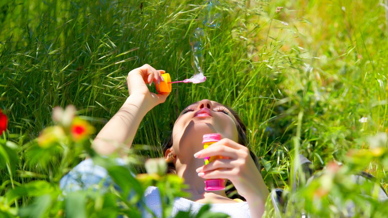 Wallpaper Young girl lies on green grass with soap bubbles