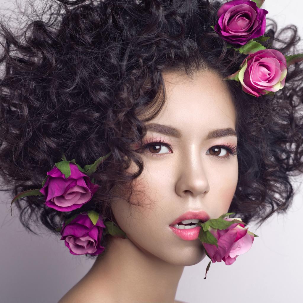 Wallpaper Young girl with beautiful hair and chrysanthemum flowers in hair