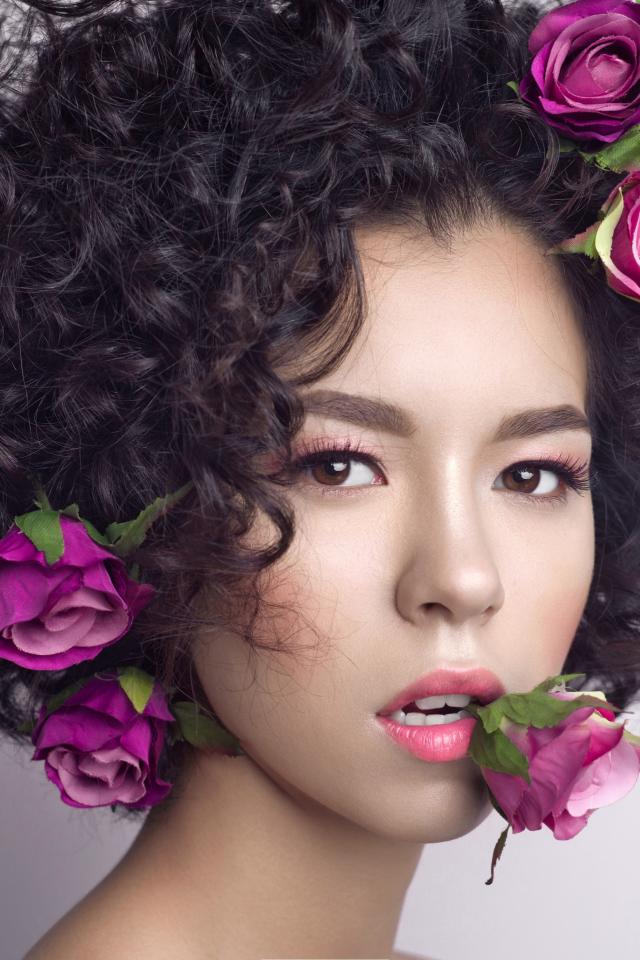 Wallpaper Young girl with beautiful hair and chrysanthemum flowers in hair
