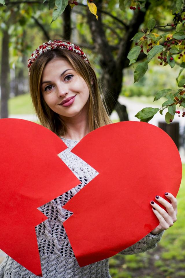 Wallpaper Young girl with a broken red heart in hands