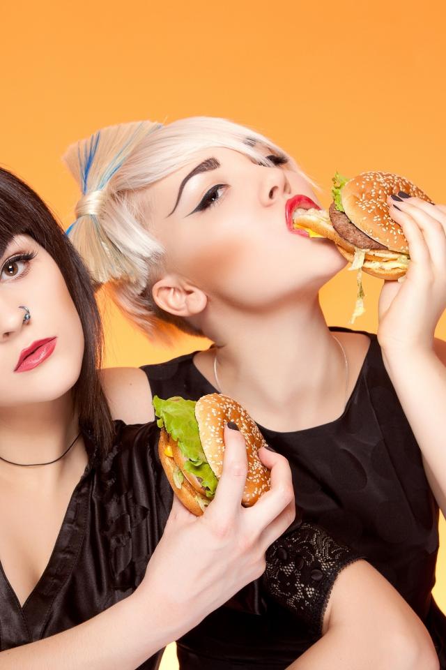 Wallpaper Two girls with bright make-up with hamburgers