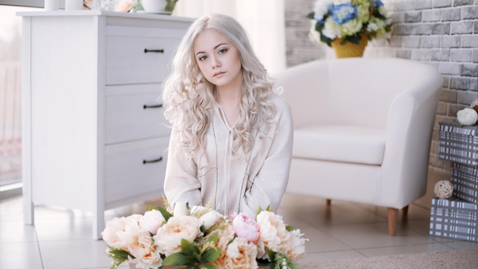 Wallpaper Blonde girl with peonies sitting in the room