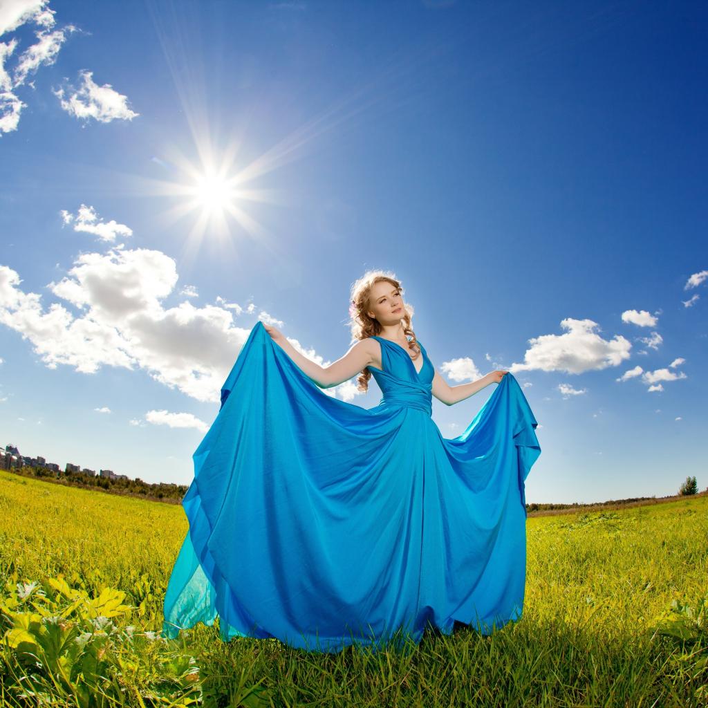 Wallpaper Girl in a beautiful blue dress against the sky